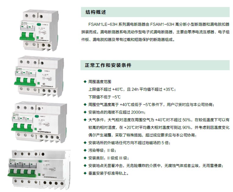 适用范围 FSAM1LE-63H 系列漏电断路器适用于交流50Hz(或60Hz)、额定电压400V 及单相230V,额定电流自3A 至63A 的线路中,具有漏电触电、过载、短路等保护功能,还可以根据用户要求,增加过压保护功能,保障人身安全和防止设备因发生漏电流造成的事故,并可用来保护线路的过载和短路,在正常情况下作为线路的不频繁分断和转换之用,额定剩余动作电流30mA 的漏电断路器可对人身触电提供直接保护。 本产品符合标准:GB16917、GB10963、IEC61009、IEC60898。